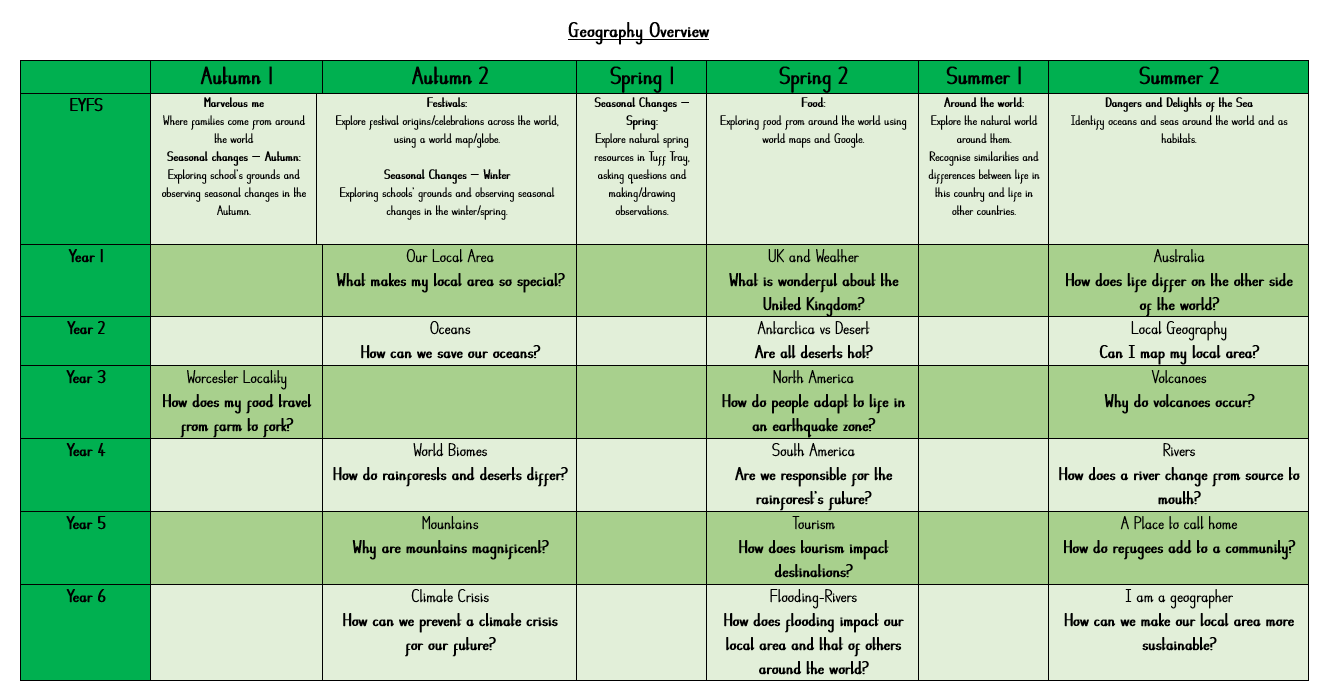 - An extensive base of geographical knowledge and vocabulary which is appropriate and accurate evolving from EYFS to Key stage 1 and through Key stage 2;
